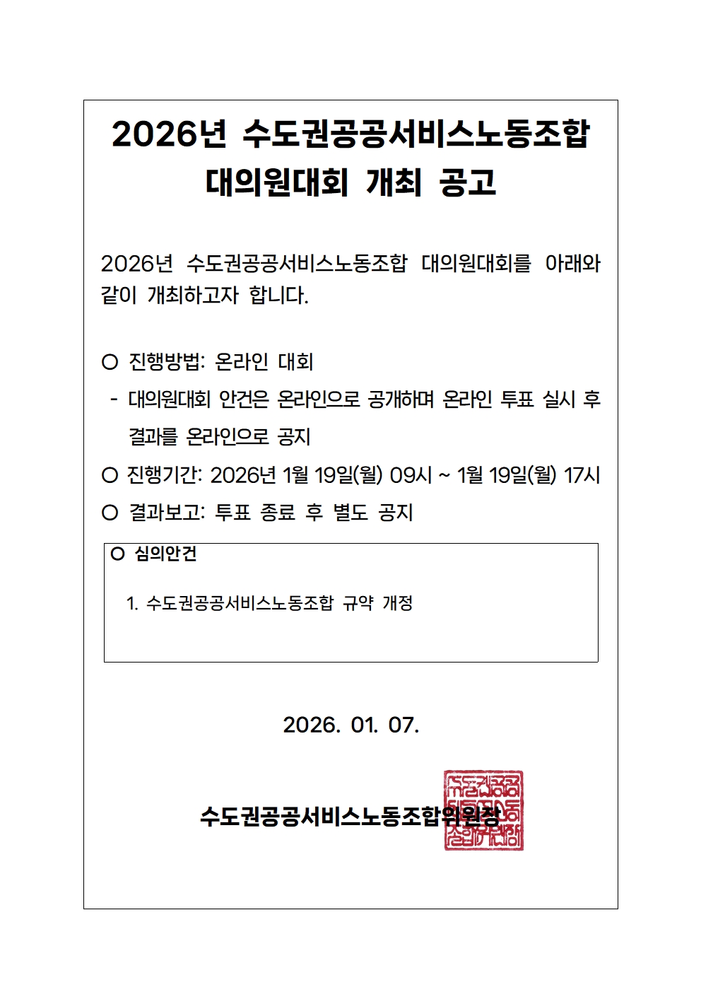 2026년 수도권공공서비스노동조합 대의원대회 개최 공고