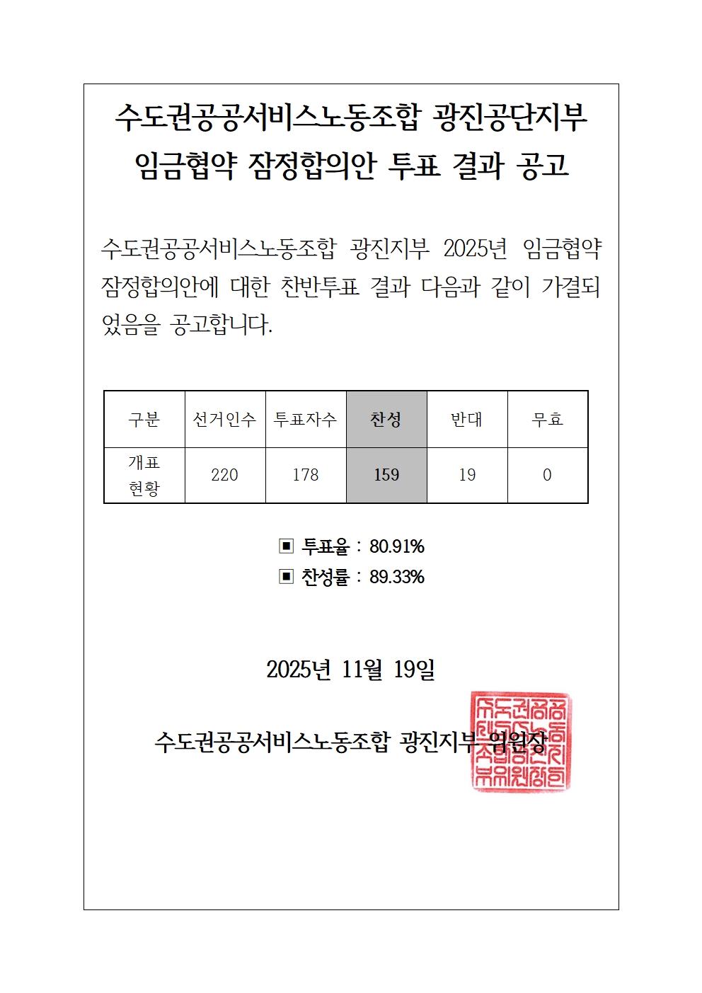[광진공단지부] 2025년 임금협약 잠정합의안 찬반투표 결과 공고
